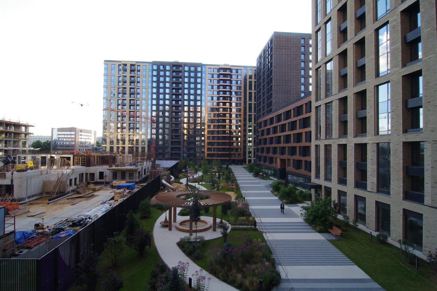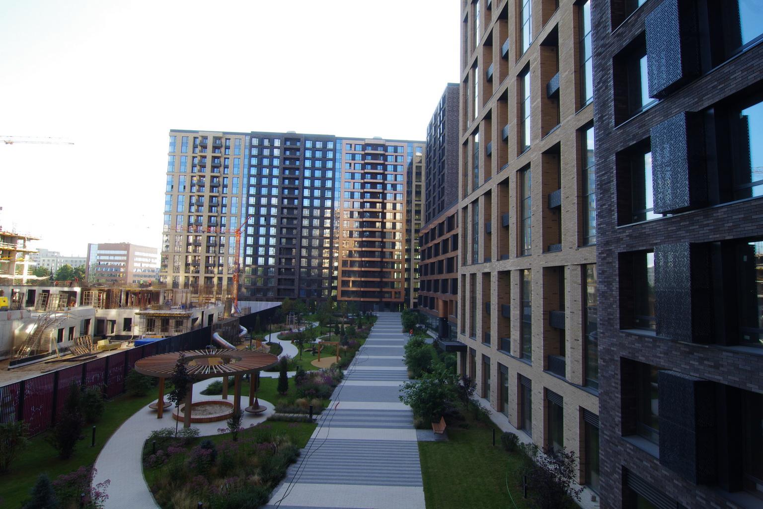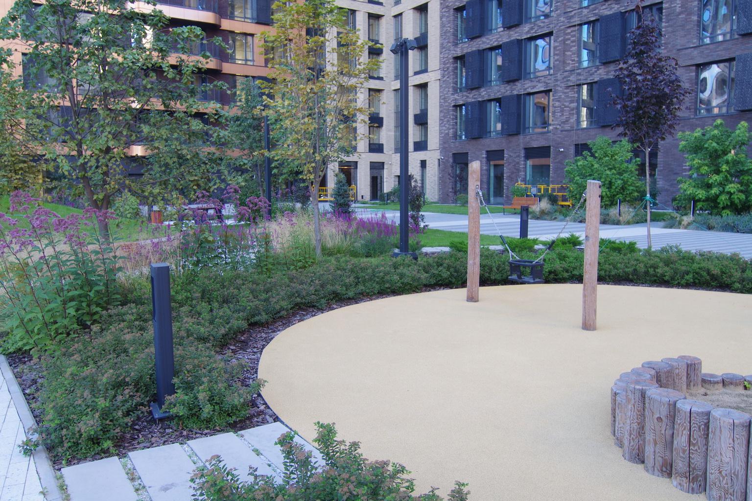 Закрытая территория ЖК с концепцией ландшафта с локациями для работы и отдыха, детскими комплексами для разных возрастов и сценариев игрового досуга.
